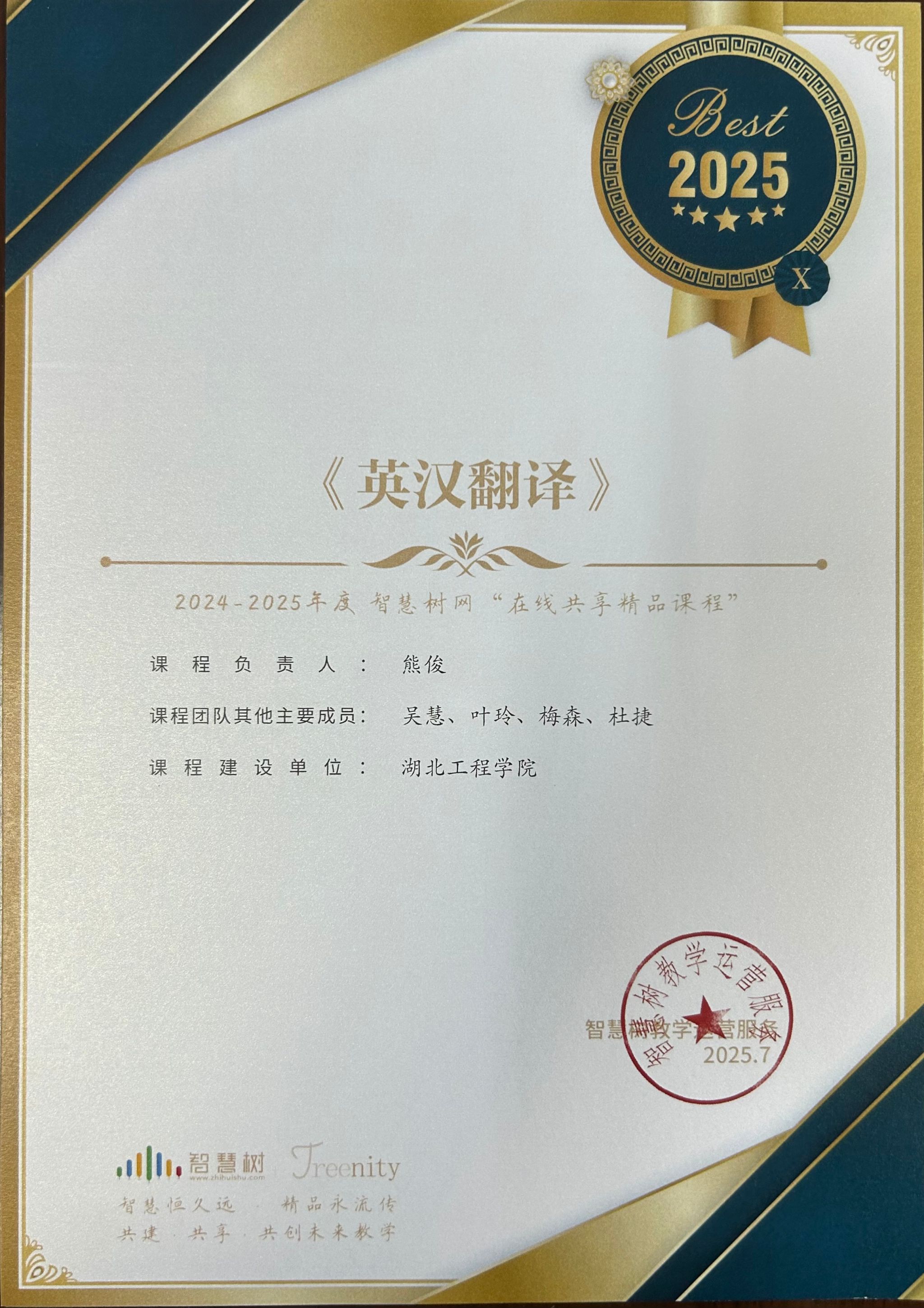 近日,智慧树网公布了2024-2025年度“在线共享精品课程”评选结果,我院副院长熊俊教授博士主讲的《英汉翻译》在线课程成功入选。这是我院在课程建设方面取得的又一阶段性成果,充分展示了我院在教育数字化和课程共享领域的积极探索。