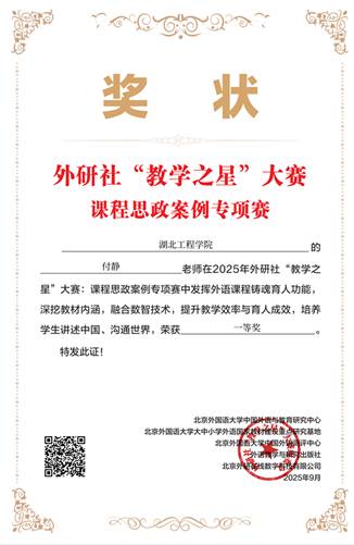 近日,我院付静老师在2025年外研社“教学之星”大赛课程思政案例专项赛中表现突出,凭借扎实的专业素养与创新的教学设计,荣获一等奖。