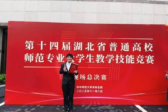 2025年11月8日,第十四届湖北省普通高校师范专业大学生教学技能竞赛现场总决赛在华中师范大学落下帷幕。我院2023级英语(师范)专业谭海同学凭借扎实的专业功底与出色的现场表现,荣获高中英语组一等奖。
