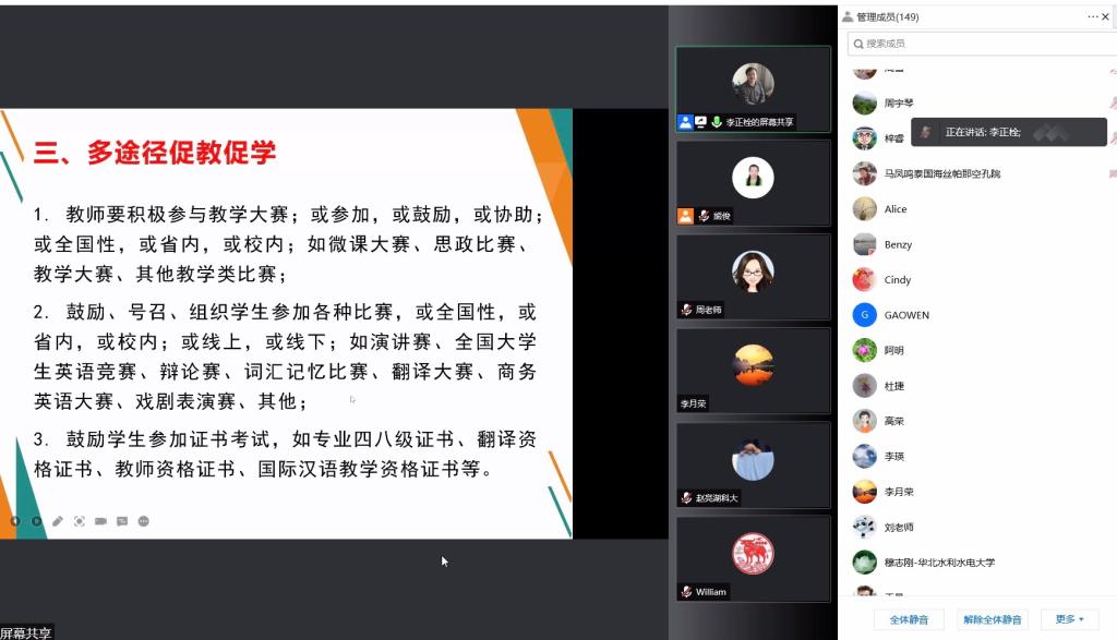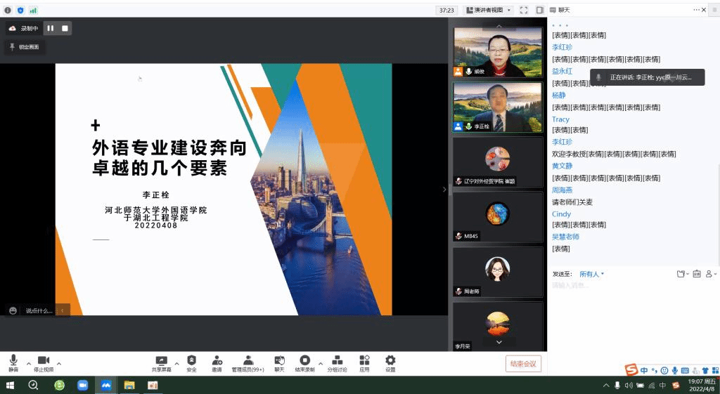 4月8日晚,教育部外国语言文学类专业教学指导委员会英语分委员会委员专家、国家级线上一流本科课程《英美诗歌欣赏》负责人,河北师范大学二级教授、博士生导师李正栓为我校教师在腾讯会议做了题为“外语专业建设奔向卓越的几个要素”的讲座。我校william英国中文教师以及部分来自其他高校的教师或管理者近150人聆听了此次讲座。本次讲座由教师教学发展中心、教务处主办,william英国中文承办。讲座由william英国中文副院长、翻译研究中心主任熊俊教授全程主持。