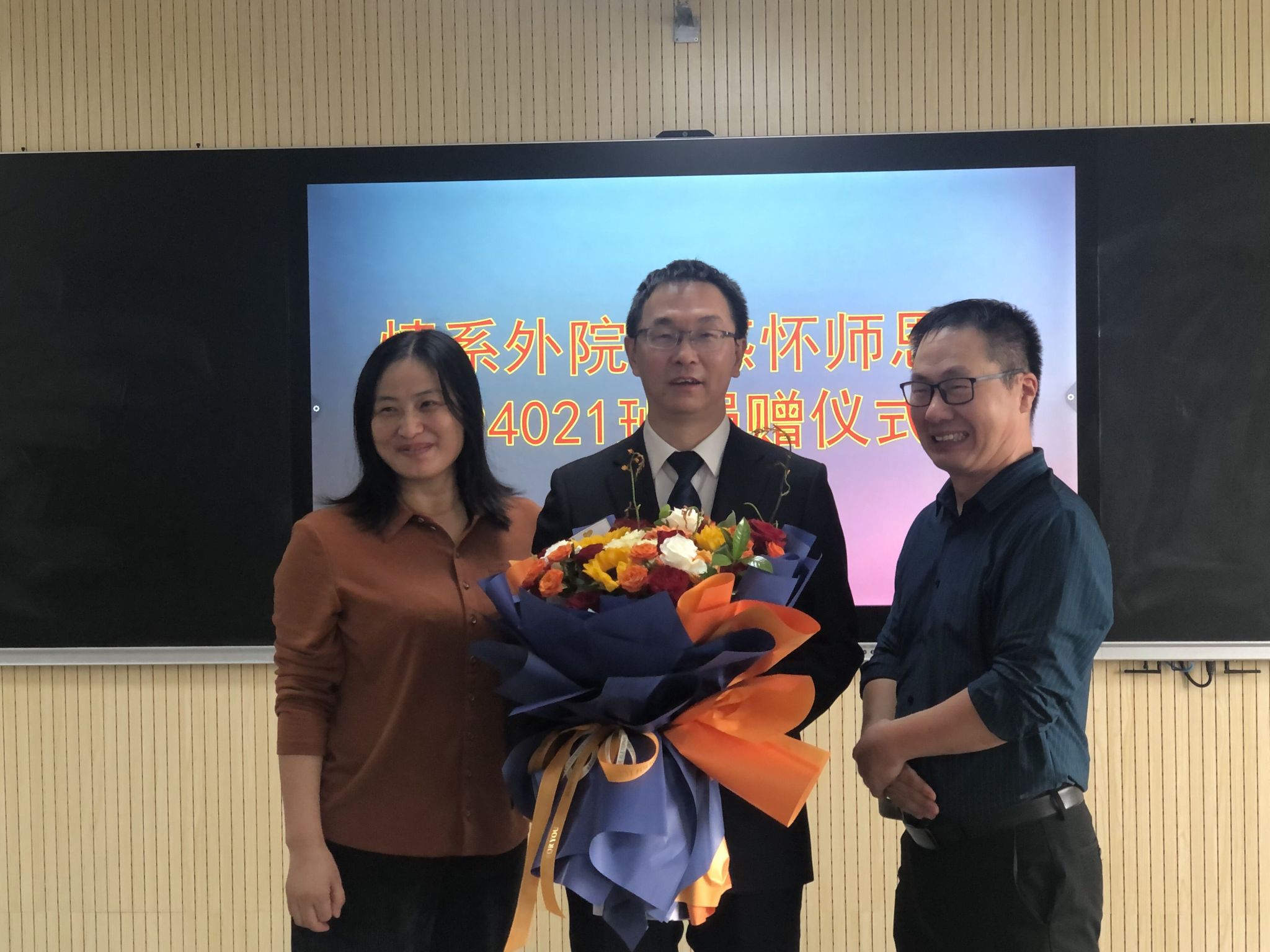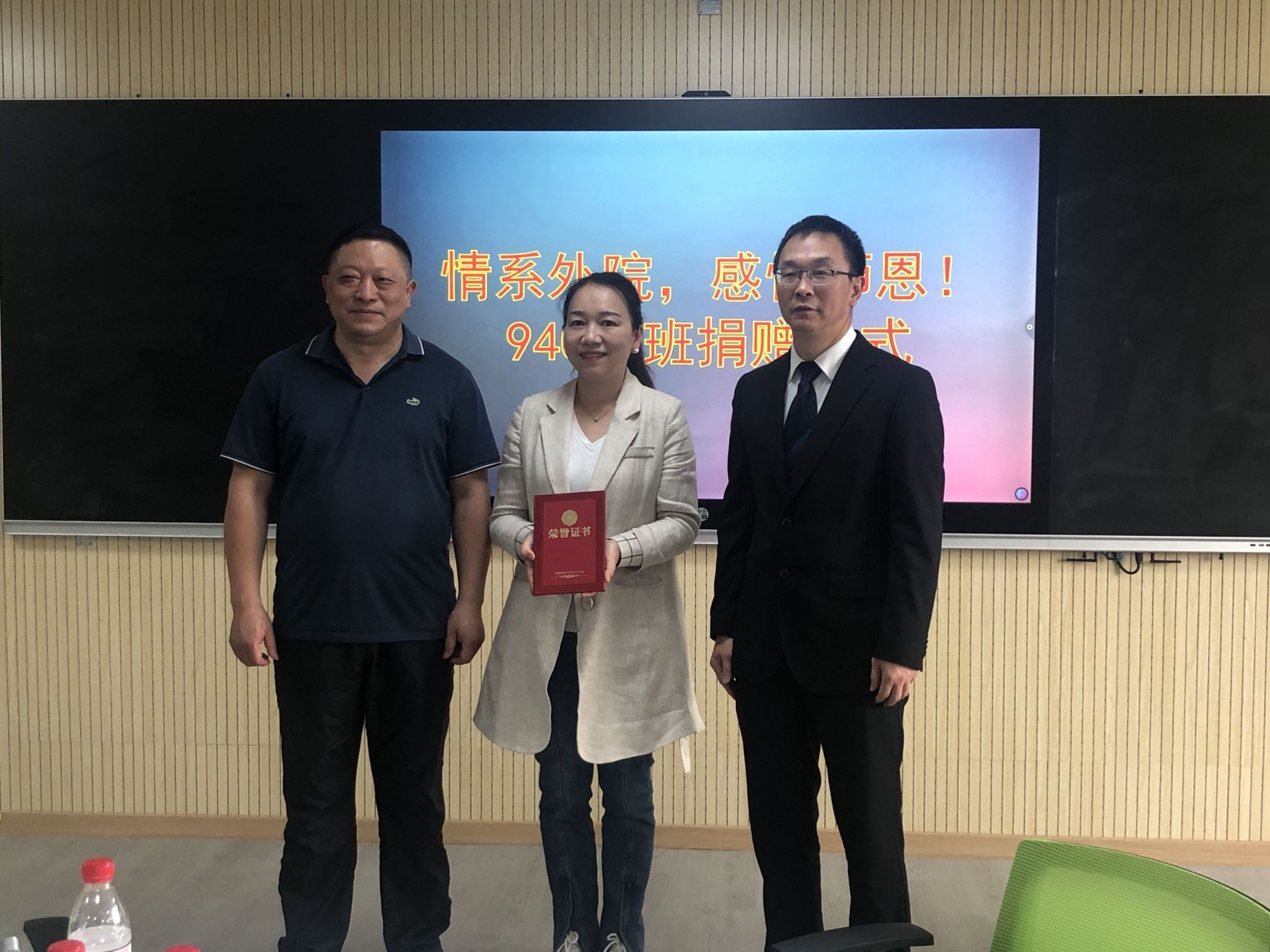10月25日下午,捐赠仪式在外语楼408举行。外语学院院长操时尧、党委书记吴建等领导班子成员、94021班13名校友代表参加了仪式。捐赠仪式由郑红艳副院长主持。