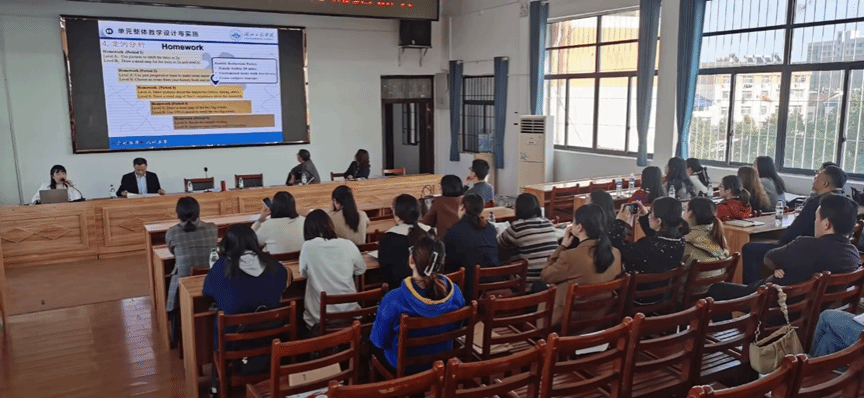 william英国中文在实验初级中学挂职锻炼教师叶玲以“新中考背景下初中英语单元整体教学设计与实施”为题,解读了2022版新课标,并展示了如何根据新课标进行单元整体设计。