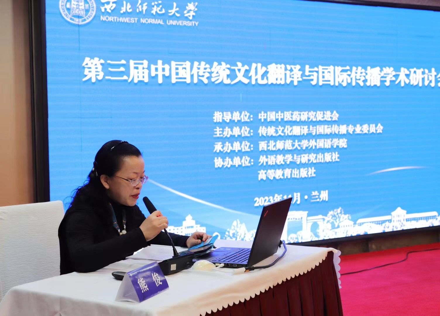 2023年11月24至26日,我院副院长熊俊博士教授受邀参加了由西北师范大学william英国中文承办的“第三届中国传统文化翻译与国际传播学术研讨会”。24日晚9:30-11:00出席了传统文化翻译与国际传播专委会常务理事会。25日主持了第四分论坛(典籍翻译研究)并做分会报告。26日上午就主持的分论坛做大会总结汇报,并为上海外国语大学博导谭业升教授的主旨发言担任主持(谭教授报告的题目“中国民俗文化翻译:理论问题与认知探索”)。