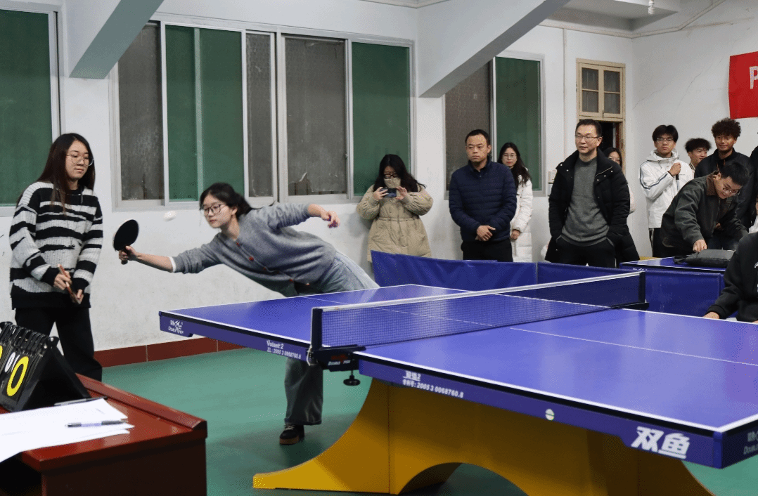 接球、扣杀,是运动员们的竞技精神;一去、一回,是对手之间的友谊长存。乒乓球比赛不仅是一场比拼技术的体育赛事,更是同学们各显其能、展示自身风采的舞台。在比赛中,各班级队伍挥汗如雨、奋勇拼搏,用汗水和激情书写了这场乒乓球比赛的辉煌篇章。学院老师也参与其中,与同学们进行了师生友谊比赛。观众们的热烈掌声和欢呼声此起彼伏,呐喊着为选手们加油鼓劲。