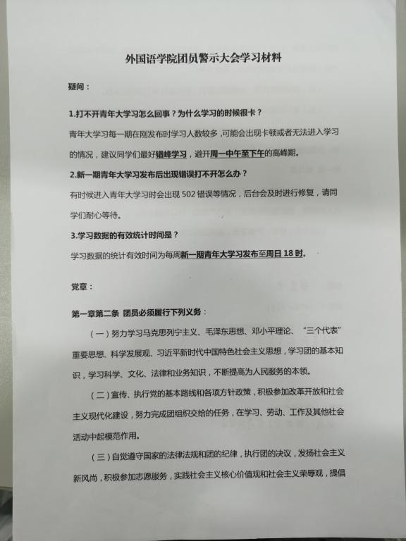 大会共分为三个部分:清点到场人数、集中学习与教育团员规范、现场填写登记表。在会议上郭洁老师领学了《团章》第一章第二条内容,明确了共青团员的义务和责任;解答了青年大学习常见问题;与现场学生分析了青年大学习学习的实际困难并提出解决办法。