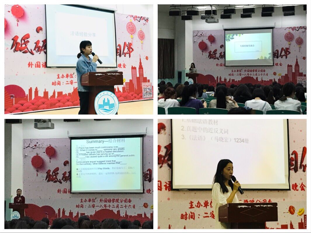 本次讲座中,来自英语专业的汪丹和李璐瑶同学以英语专业四级考试为立足点,结合典型难题和易错题,围绕听力、阅读、写作、词汇及语法五个方面,剖析了解题及学习过程中的问题,分析了考试的命题规律,分享了自己的思维方式和临考技巧。来自法语专业的田静和李菲同学提醒备考同学掌握好复习时间,抓大放小,在学习过程中要具备双语思维,充分考虑到文化差异,培养良好的学习方法和学习习惯,考试中遇到难题不要慌,要努力调整好心态,坚持到底,得到应得的分数,争取顺利通过考试。之后的提问环节中,四位学姐现场为同学们答疑解惑,激励同学每天坚持学习。